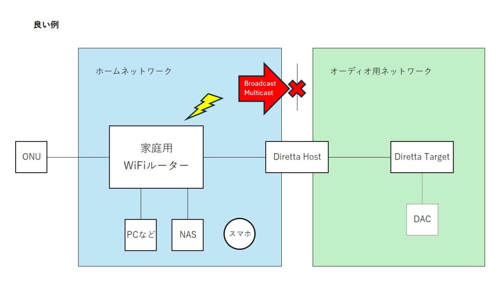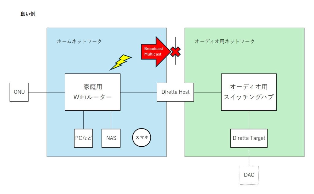 ショップ等でよく見かけるこういうネットワーク図はよくないです。Diretta Host – Target 間の通信と、Diretta Host – その他機器間の通信を同じNIC/LANケーブルで処理することになります。