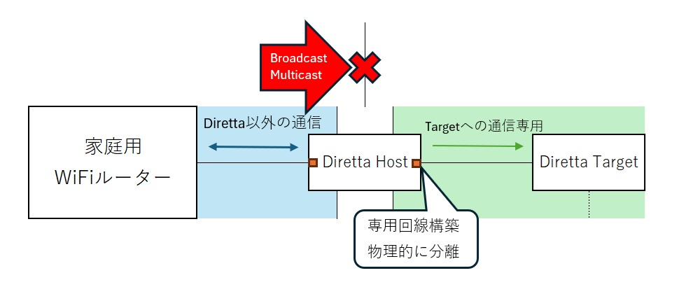 こうすることで、Diretta Host – Target間の音楽データしか流れないネットワークと、それ以外のデータが流れるネットワークにわけられます。これの利点は複数あって